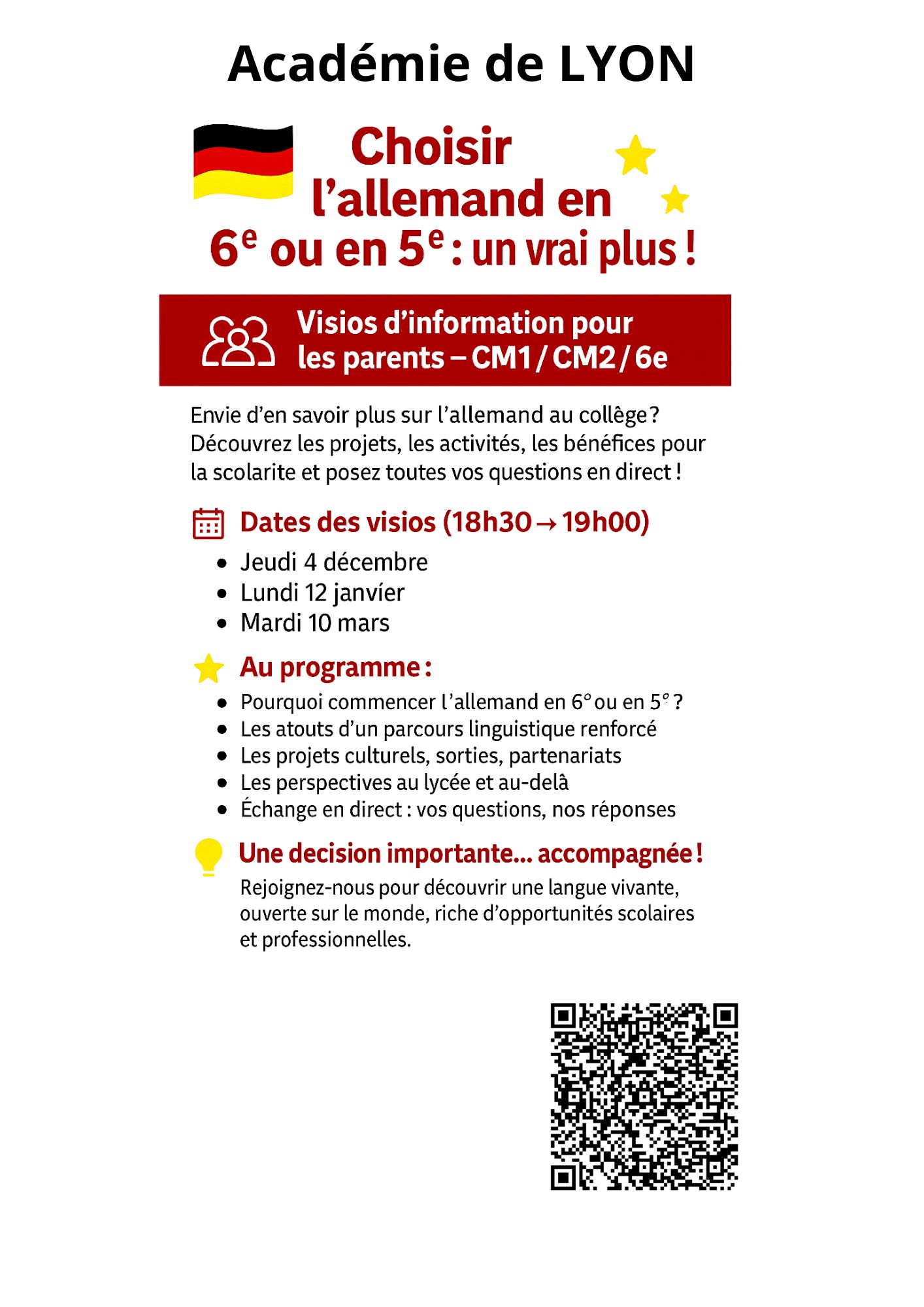 LUNDI 12 JANVIER à 18h30 pour les élèves de 6ème, une visio vous permettra d'éclairer vos choix concernant le choix de l'allemand en LV2.